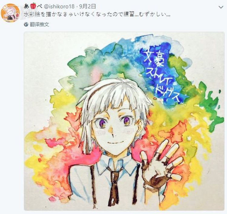 发帖的日本网友用水彩自绘的《文豪野犬》里的主人公中岛敦
