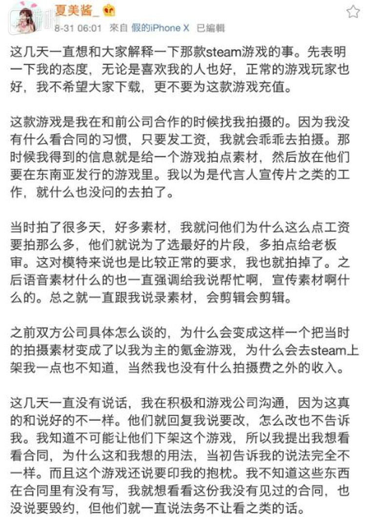 这起差评风波发生后,在游戏中饰演第一女主的Coser夏美酱也在微博上声明,对此次拍摄内容的用处完全不知情。自己和游戏开发商的合作是经由第三方经纪,从来没看过合同,无法为自己维权。同时,她也呼吁大家不要购买这款游戏。
