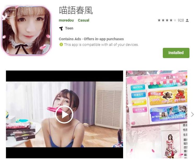 《喵语春风》现在还在Google Play上运营,有超过5万次的下载数,900多个评价打出了 4.1的高分。