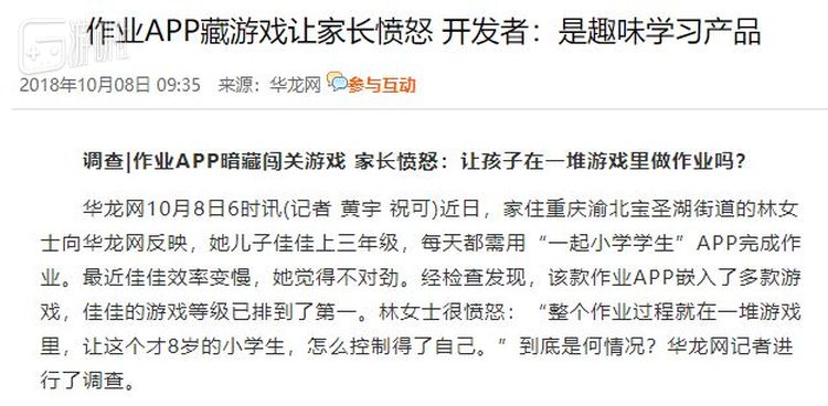 国庆长假过后的第一天,重庆新闻媒体华龙网的记者发布了一则新闻,称目前有一款供小学生使用的学习App,叫《一起小学学生》。老师可以在上面布置作业,但里面暗藏游戏,还含有相当程度的氪金元素。