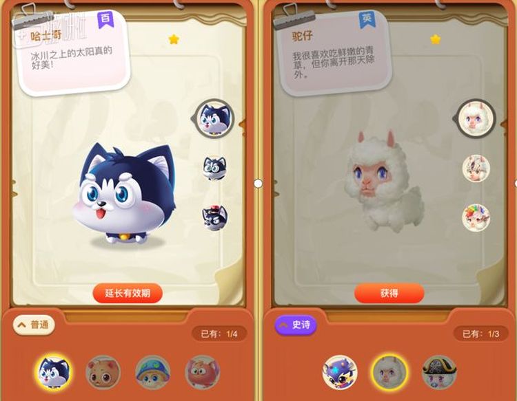 这类借鉴还有游戏里的“伙伴家园”功能。“伙伴”其实就是宠物,参照网游道具的品质称号,这些宠物被划分成了普通、稀有、史诗、传说四个等级,像蠢萌的哈士奇只有“普通”品质,而“草泥马”驼仔就成了史诗。大家都是网红动物,咋差距就那么大呢……