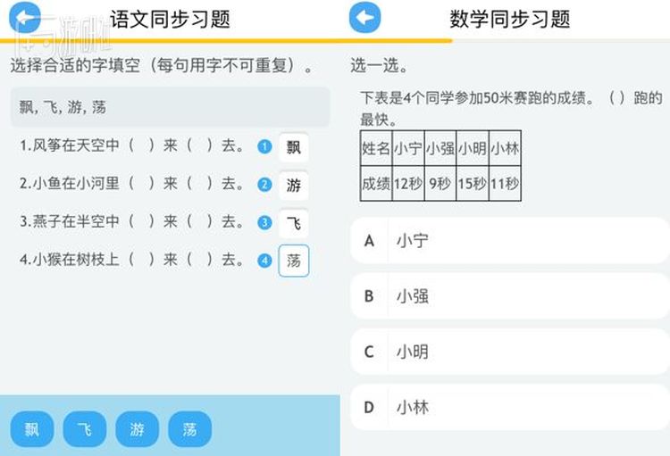 我选择不同年级把每个科目的作业都尝试了一下,感觉题目设置与学习进度的还是比较匹配的。例如三年级上册的语文练习主要集中在动词、拼音和偏旁部首的使用,数学则主要考验计量单位常识、比大小和简单的算术等,都与课本内容同步。