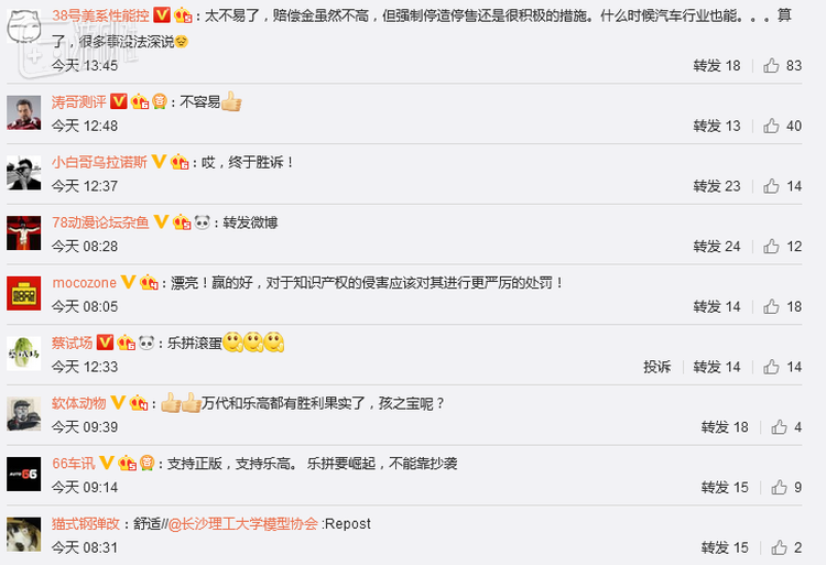 此次乐高在知识产权案件上再次胜诉,也让国内的乐高玩家们感到十分欣慰。大批玩家在微博下表示支持,并期待乐高在知识产权维护上继续扩大战果。
