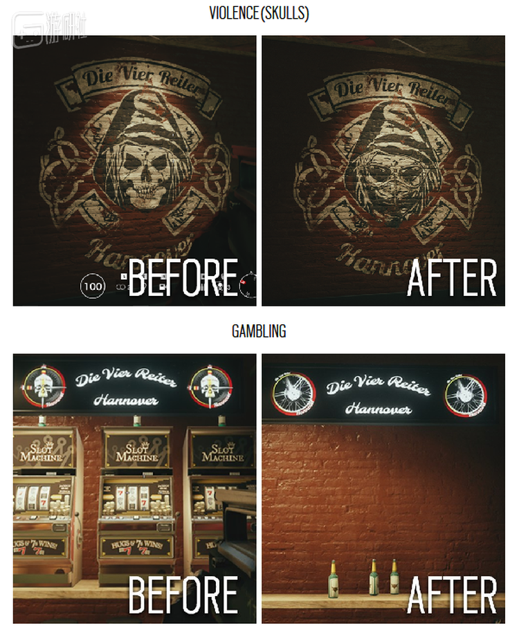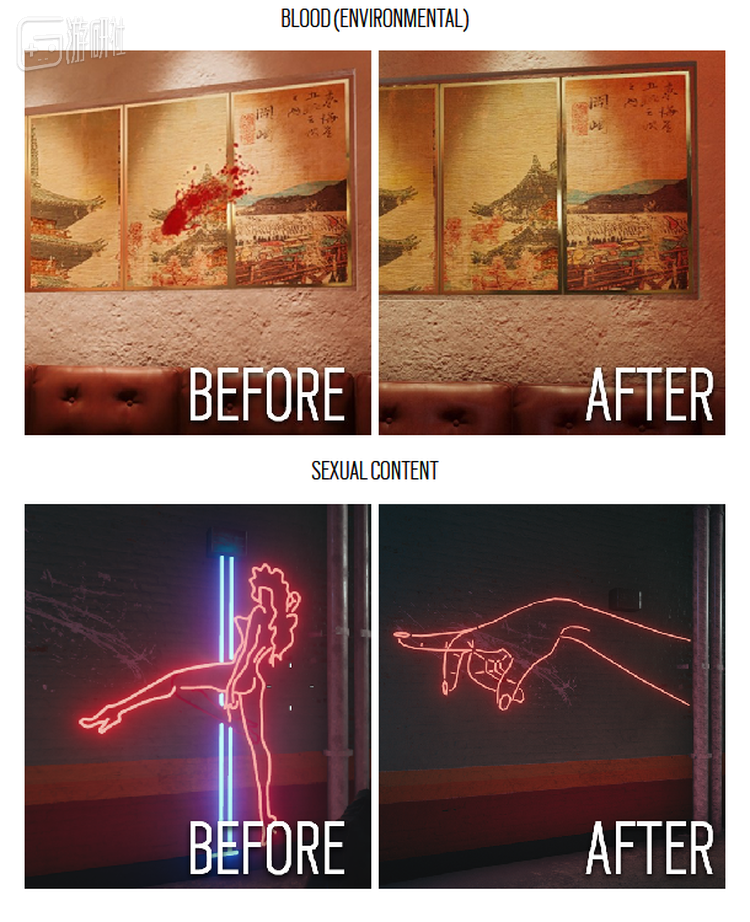 从育碧给出的修改范例可以发现,为了确保游戏在亚洲地区正常上线,育碧将原本游戏中涉及到暴力、性、赌博和血腥元素的地图要素和图标都进行了改动,改动幅度不可谓不大。