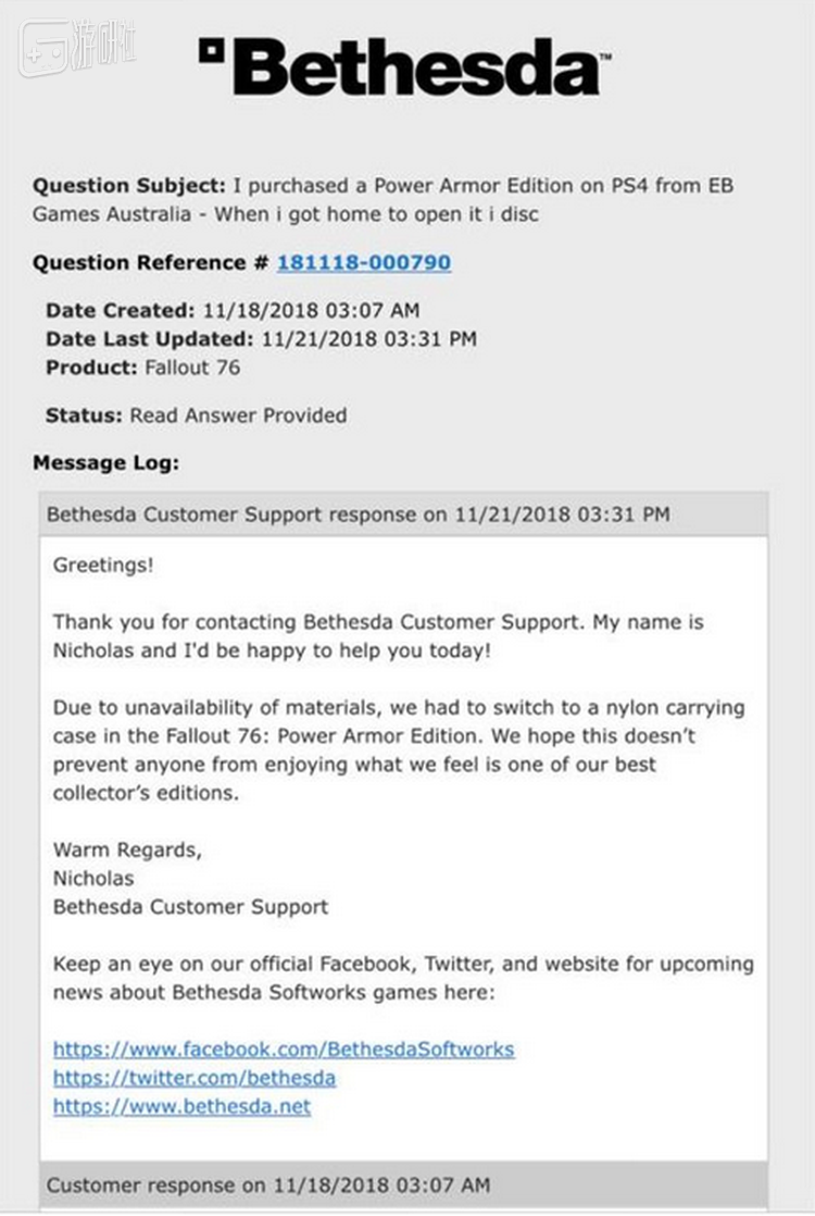 在回复中,B社毫无任何愧疚与抱歉之意,只是轻描淡写地给出了一个“因为材料不可用,我们将其替换为了尼龙包装袋”的理由,并表示,“我们希望此事不会影响大家对于我们最棒的版本之一——《辐射76》动力机甲版——的喜爱”。