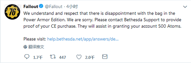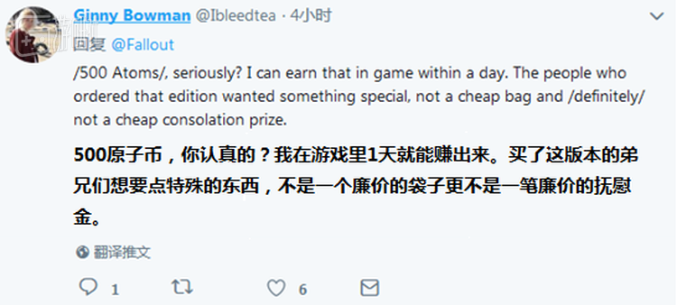 在此事被爆出了几个小时之后,B社终于在推特上发布了他们的补偿方案:玩家可凭借购买证明获得500原子币(游戏货币)的补偿。