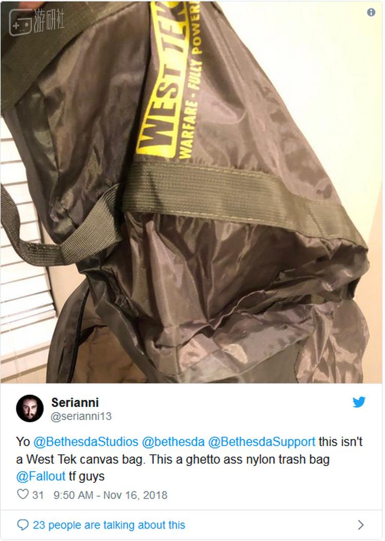 而如今,又一条不利消息让B社的声誉遭受打击——《辐射76》价值200美元的动力机甲版中附赠的周边在发售之后悄然缩水了。这回往B社身上压下的又一根稻草,竟然不过是一只小小的帆布袋。