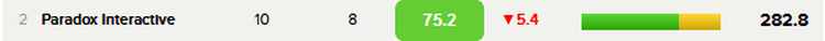 Paradox Interactive去年的游戏媒体评分下降严重,足足下降了5.4分,尽管如此,它依然稳定保持在中型游戏发行商榜单的第二名。