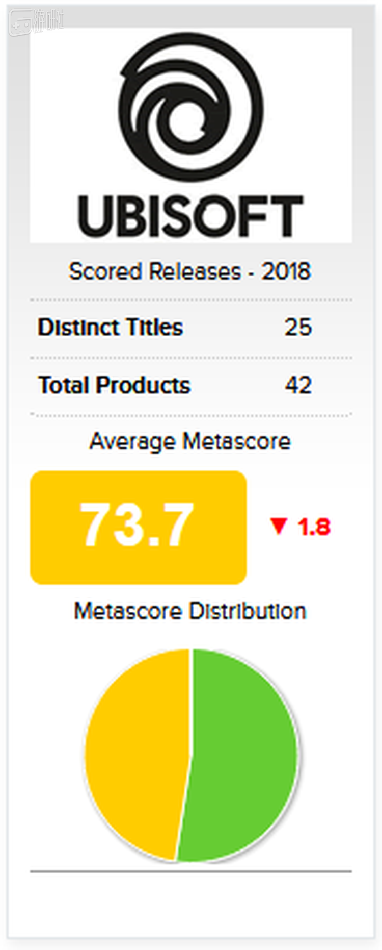 育碧2018年名次上升一名,从第六名上升到了第五名,但游戏的平均评分却下降了1.8分。