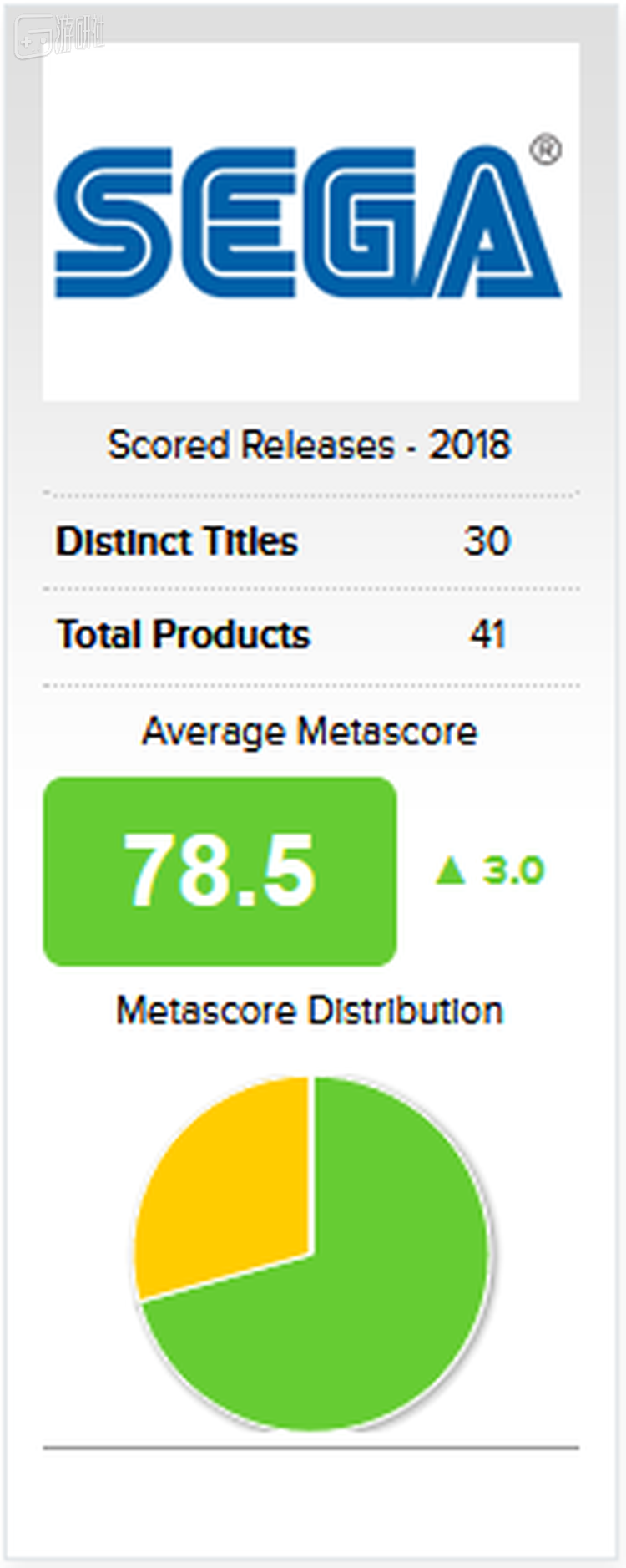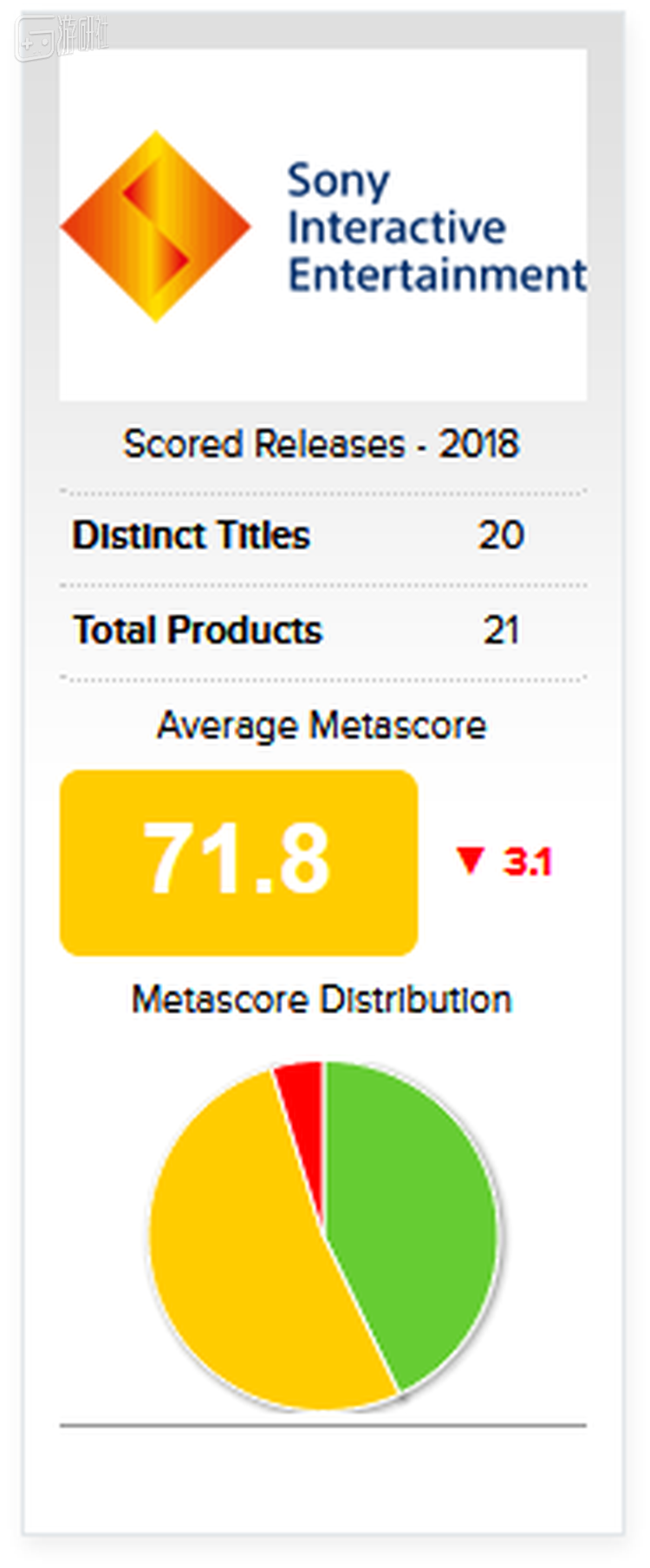 2018年索尼的名次提升了一名,但是游戏平均媒体评分却下降了3.1分。不过索尼是去年所有游戏开发商中获得“非常好”评价(媒体评分高于90分)的游戏最多的开发商。之所以评分下降,还是因为发行游戏的得分两极分化比较严重,高的很高,低的很低。