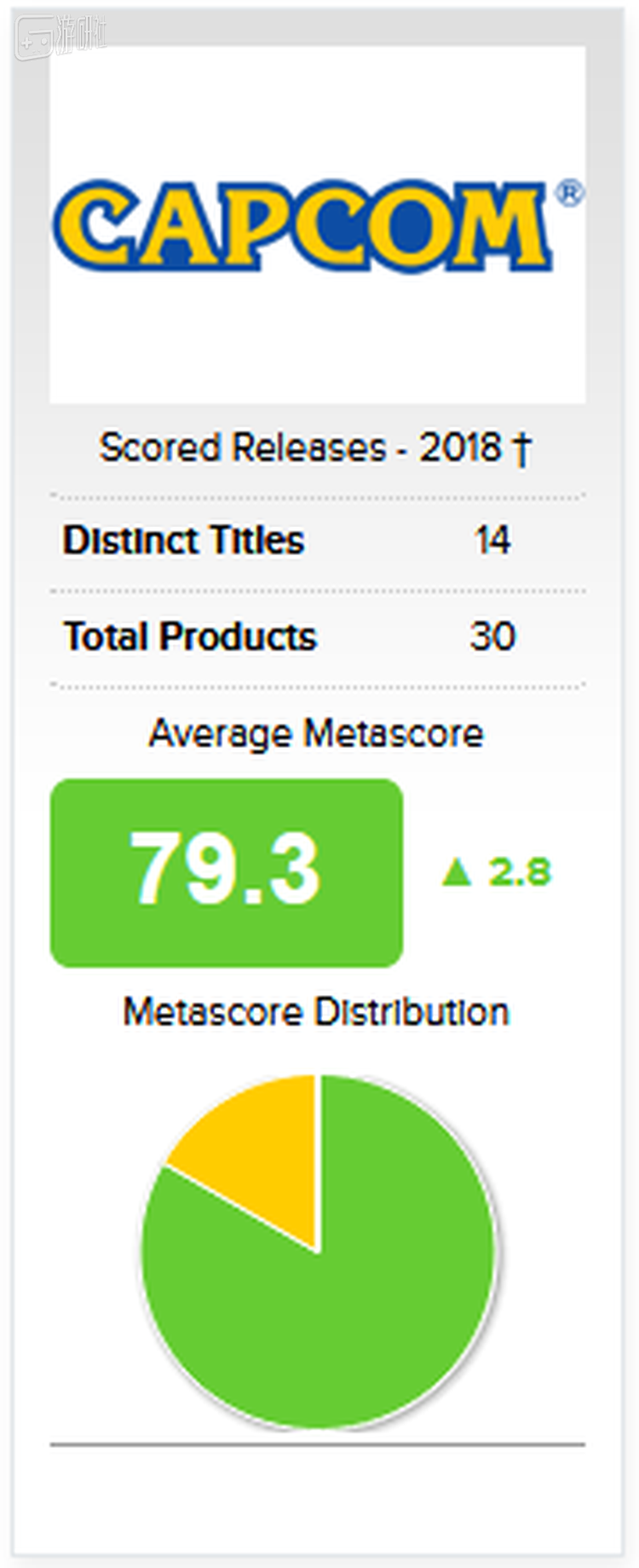 2017年,卡普空在这份榜单上还排在第五名的位置,2018年就已经跃升为第一。这家历史长达40年的日本公司在去年可以说是老树开新花,成绩喜人。卡普空去年一共在各平台上发行了30款游戏,其中25款游戏在MC上的媒体评分超过75,好评比例达到83%。除此之外,游戏的平均MC评分也上升了2.8分。