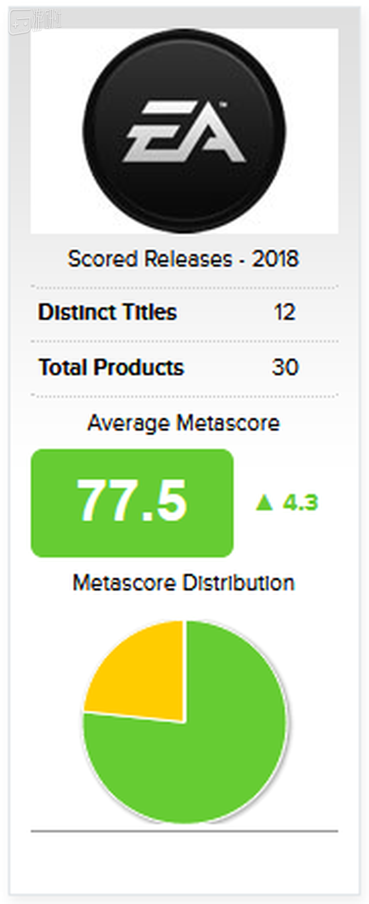 2017年EA因为发行游戏数量小于12款所以被列入了中型游戏开发商榜单,今年总算擦着边达到了MC认证的大型游戏开发商标准。值得注意的是,EA的游戏平均媒体评分足足上升了4.3分,其中EA Sports为止做出了卓越贡献:EA去年的体育类游戏平均媒体评分高达78.4分。
