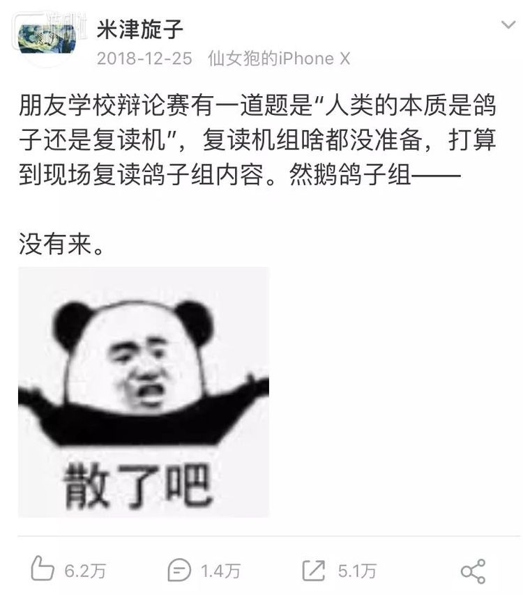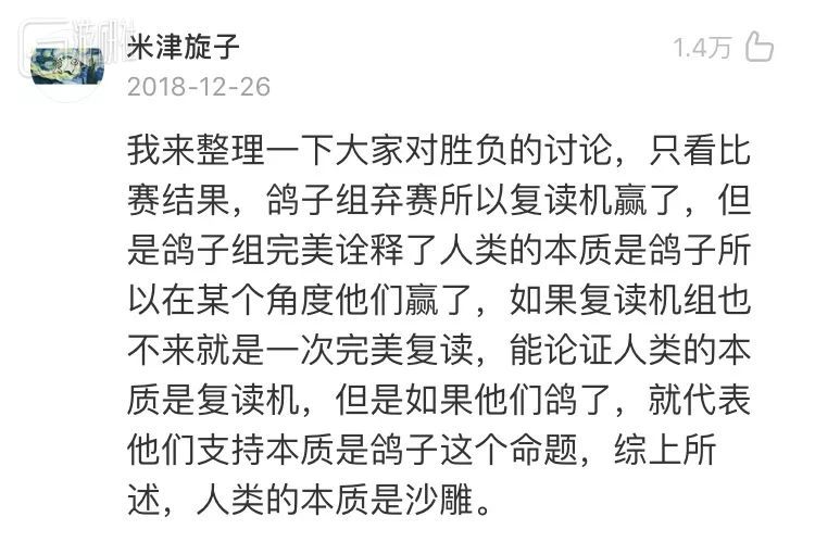 去年圣诞节,博主@米津旋子在微博上分享了一道朋友学校的辩题:人类的本质到底是复读机还是鸽子?据说复读机队原本的打算是全程复读鸽子的发言,然而,鸽子队根本就没有到场……