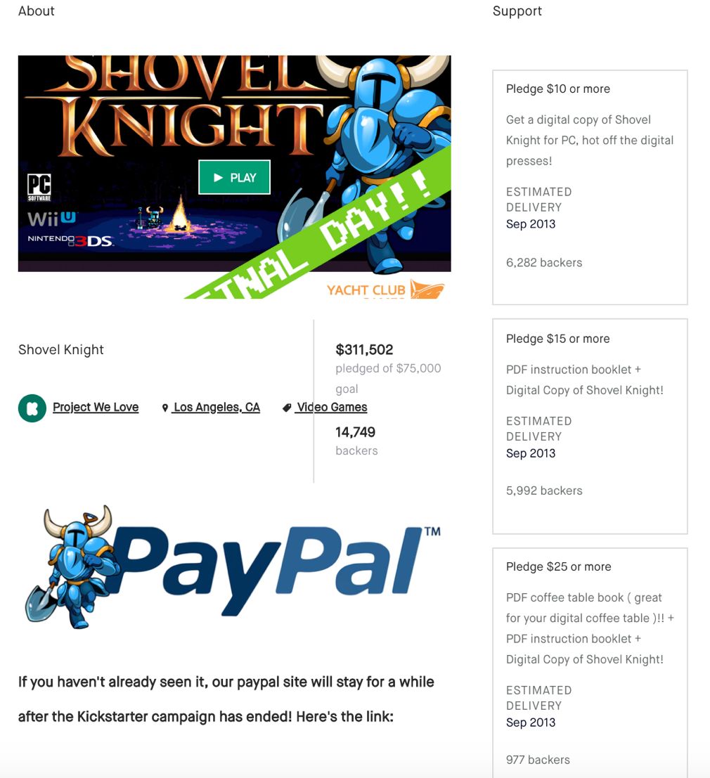 现在的众筹游戏,一般都有很多投资奖励等级。拿《铲子骑士》来说,投资10美元就可以得到数字版游戏,投资75美元就可以参加和开发团队的见面会。