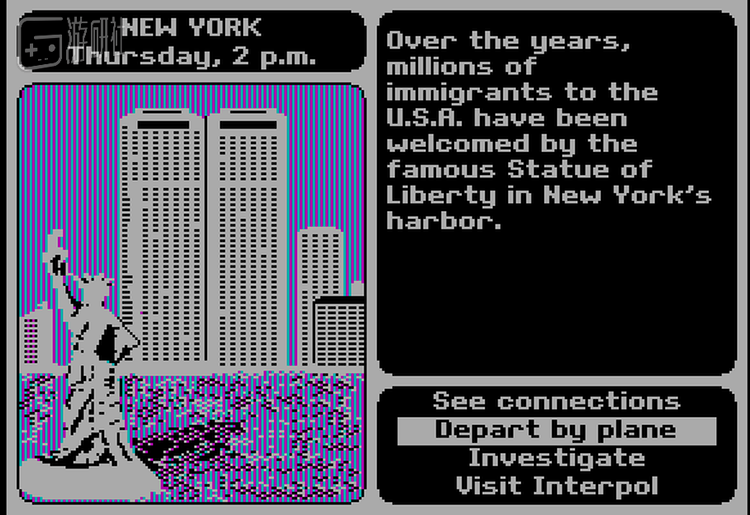通过选项,玩家可以穿行于各个著名城市搜集信息,不过由于当时的技术所限,所谓“周游世界”也只是提供一张简单的地标建筑像素图而已。