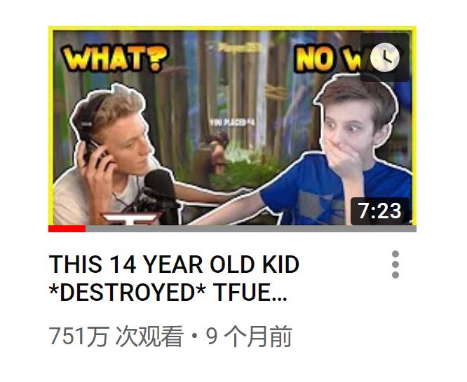 格里芬的《堡垒之夜》之路就此走上了正轨。以这个视频为开端,格里芬以“14岁玩家又击败了XX”为主题制作了一系列视频——这看起来有点“碰瓷”的意思,但是格里芬的游戏实力确实不错,再加上其他主播们对自己被一位14岁的孩子挑战也没有什么反感——格里芬后来的不少视频都取得了百万级别的观看,他Youtube的订阅数也攀升到了100万人次,Twitch也有了几十万关注,算是正式跃入了“大主播”的行列。