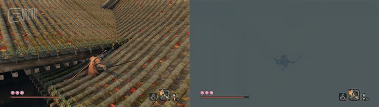 就这个局部关卡来说,《只狼》采用了非常标准的潜行关卡的设计思路。只是游戏里不标注敌人位置和视野范围,玩家不容易察觉到而已。当然在《只狼》里即便潜行失败,玩家也可以强杀几个敌人之后再脱离战斗,游戏并不阻挠玩家采用自己的思路去攻略关卡。