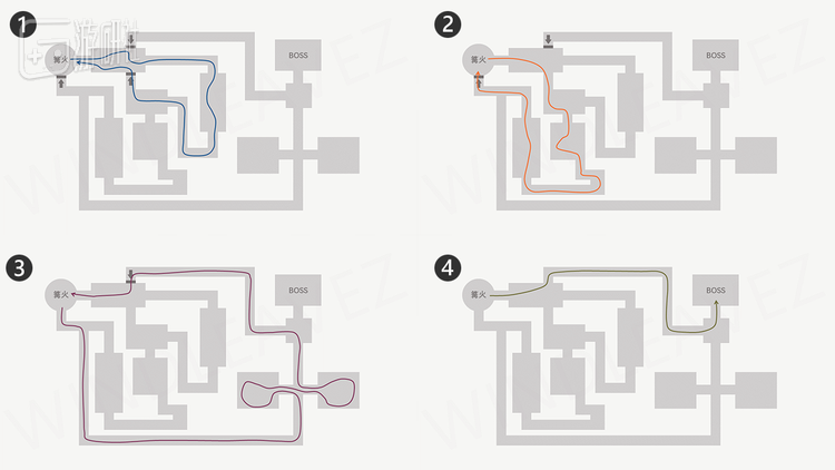 由于游戏整体难度较高,传送点(篝火/灯)又能够提供升级、传送等服务,所以《魂》系列的地图往往是围绕传送点展开的,玩家经常会有绕了一圈又回到初始传送点的体验。在上图中,玩家从同一个传送点出发,每次的路线都不同,一个传送点起到了四个传送点的作用。