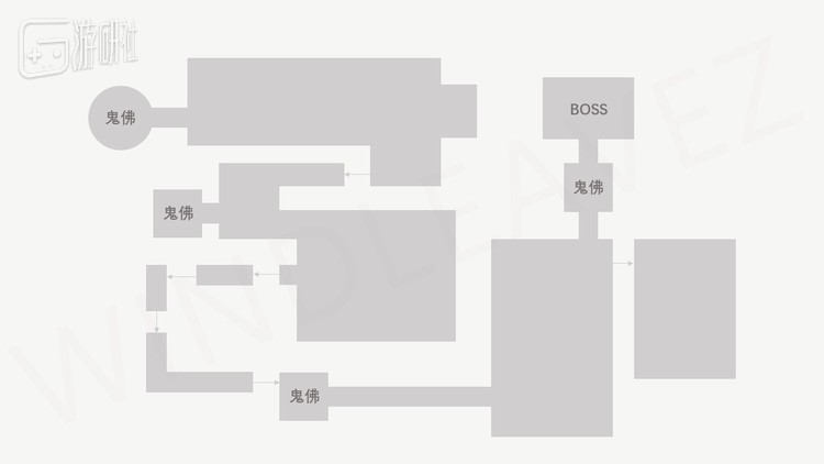 一张典型的《只狼》地图给人类似下图这种感觉,每个鬼佛像后面都是一个相对开阔、立体的战斗空间,便于玩家自由规划暗杀的路线。通过了一块战斗区域之后,紧接着就是下一座鬼佛像。