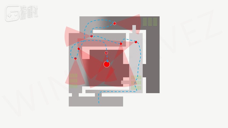 用游戏早期精英敌人武士大将山内典膳的关卡举个例子。其中大圆点代表山内典膳,小圆点代表杂兵,其中包括视野较远的远程兵种、视野更近的近战兵种以及会通风报信的铜锣兵。红色半透明扇形代表敌人的视野范围。地图的深浅代表地形高低,颜色越深位置越低。绿色条纹代表草地。