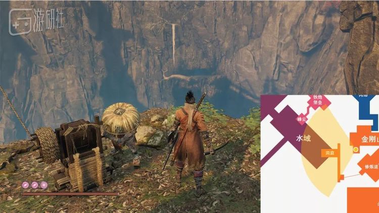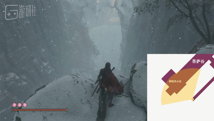 还有在金刚山斩杀白蛇后落下的山崖平台上,可以透过崖壁之间的空隙,直接看到菩萨谷“狮猿” BOSS 战的所在位置。