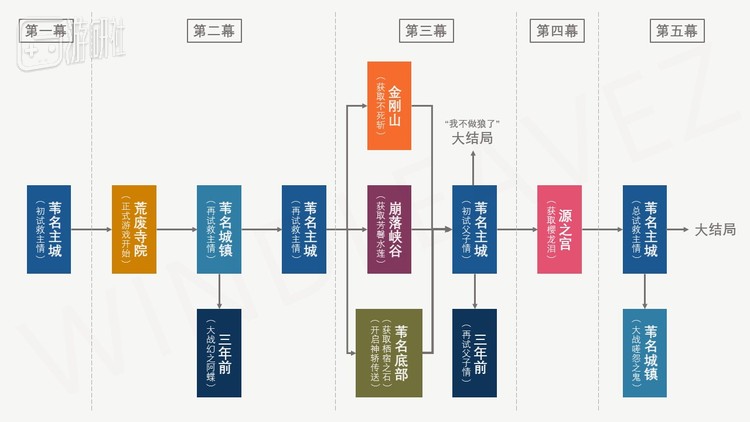 从《只狼》的游戏流程来看,整个游戏被划分为五幕。第一幕是序章部分,第二幕是再次营救主人,第三幕是寻找开启仙界通道的三种道具,第四幕是获取斩断不死的龙泪,第五幕是与游戏的最终敌人决一死战。游戏里所有的地图,都被安排在这五幕结构里。