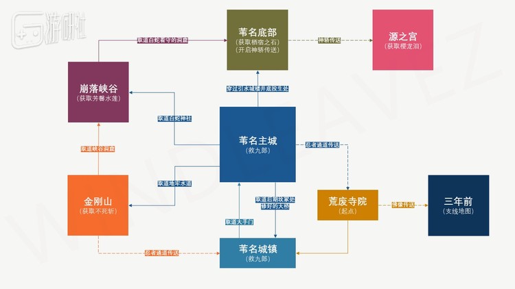 同时城镇地图特意设计成了 V 字形,以此缩短两个区域的最短距离,让玩家在第二传送点“城门道”的位置就能看到第三个传送点“虎口阶梯”的鬼佛像。