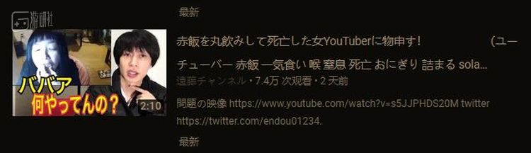 Youtube主播远藤很快上传了一期节目《对吞下饭团而死的女Youtuber说!》,这个节目获得了7万播放量。视频里的主播言语流利,但似乎说了什么又什么也没说。我只能记住一句“在Youtube里这么做是危险的,虽然这样会让你获得不错的收视率”。