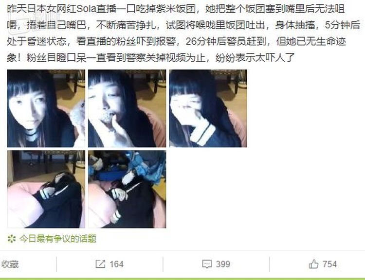 不出意料的,消息传播很快。几个小时之内,成千上万条、与Sola相关的讯息洗刷社交媒体。尽管Sola被送医之后没有任何后续讯息传来,但在她倒下的短短几个小时内,互联网已经给尚未死去的Sola提好了墓志铭:“被饭团噎死的美女Youtuber”。