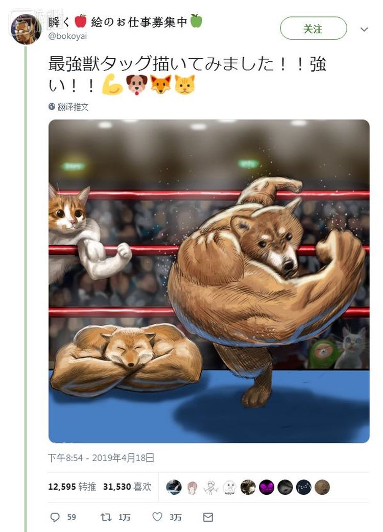 索性,一位有心人,画师“瞬く”放弃了让二位对抗的想法,他把前一阵另一个力量型选手“腕力猫”也加入其中,构建了这样一幅力与美的和谐景象:
