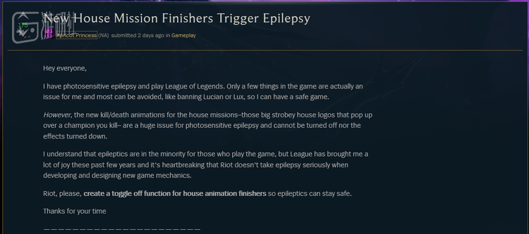 玩家Apricot Princess表示:“我知道《英雄联盟》的玩家之中癫痫患者并不多,但是这款游戏在过去几年里曾经为我带来了许多欢乐,当我发现拳头设计游戏时和拓展新机制时没有考虑到癫痫患者的情况时,我的心都碎了。”