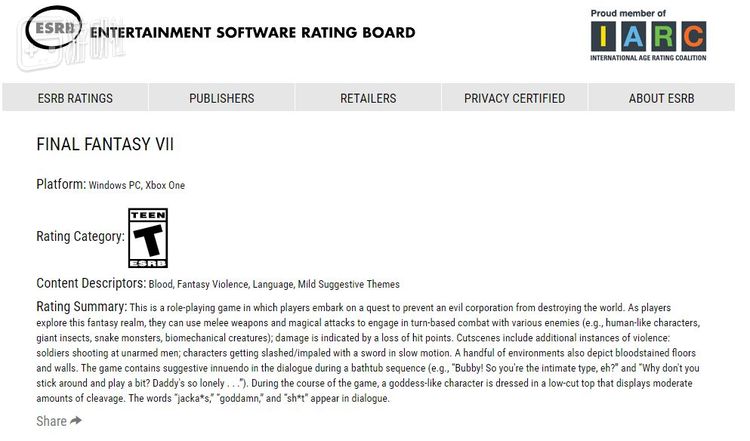 毕竟,在之前ESRB(娱乐软件分级委员会)对《最终幻想7》的重新评级里,因为包含血液、暴力幻想和温和性暗示,这个游戏被评为了T级(13岁以上)。ESRB的评语非常生动,“在游戏过程中,女神般的角色穿着低胸上衣、显露出乳沟……”