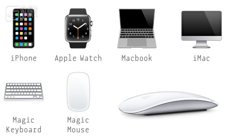 Apple 平台上各种自家产品的 emoji,以及妙控鼠标的产品图。(Emojipedia/Apple.com,笔者制图)