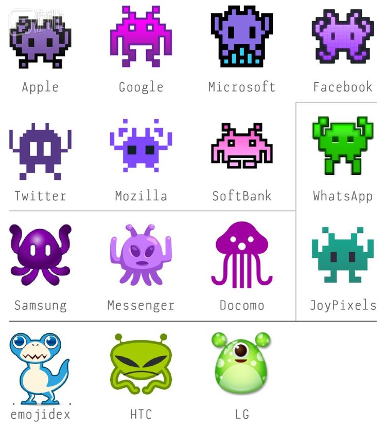 各厂商的👾。总体上可以分为四个阵营:紫色像素、绿色像素、紫色高清、另辟蹊径。(Emojipedia,笔者制图)