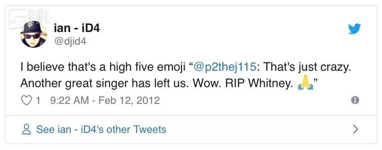 歌手惠特尼·休斯顿意外身亡后的推特讨论:“RIP 惠特尼🙏”“我相信这是一个击掌 emoji”