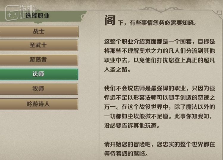 而法师的职业介绍则陡然一变,用傲慢的腔调向玩家指出,这个职业介绍界面实际上是一个圈套,是为了让玩家错过“奥术的超凡入圣之路”。至于吟游诗人……我还是不要透露太多,总之它让我在职业选择界面第三次笑出了声来。