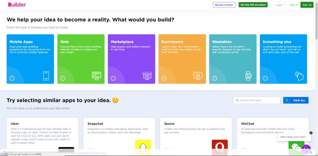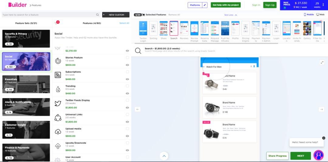 拿制作APP举例,Engineer.ai的网页会给你提供几种市面上常见的APP模式,例如微信、Airbnb、Uber(优步)等等。在你选择类型之后,他们会提供给你很多功能需求,而你则需要按照需求来进行功能的挑选。