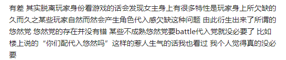 随着剧情的推进,玩家群体中逐渐诞生了“悠然党”——他们将女主角赋名“悠然”,将其看作一个独立角色,而不是像其他玩家那样带入自己。一位玩家在相关话题下解释“悠然党”的诞生,是因为玩家们开始发现女主角身上有自己并没有的一些特质,“产生代入感欠缺的问题”。