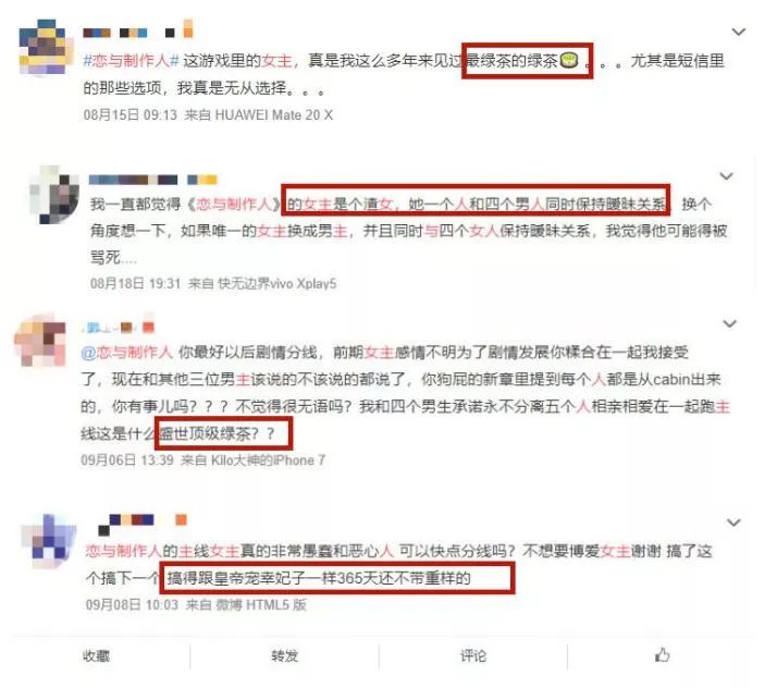 但很明显的是,很多国内的玩家对四位男子的同时追捧无法欣然接受——尽管这只是在游戏里。在网络上,有相当多的玩家怒斥女主轮流“玩弄”四位男性主角的行为,称其“绿茶”“渣女”“婊”: