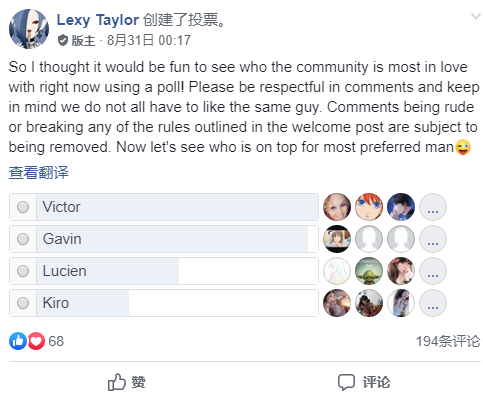 而游戏社区的总体氛围也和国内无太大差异,根据小组内的一次小型投票结果显示,人气最高的角色是李泽言。