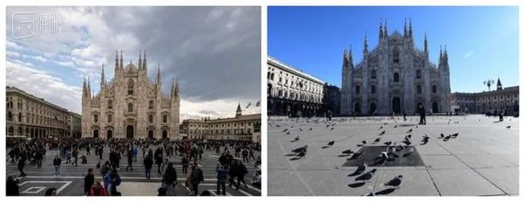 在游客不在的日子里,被加上“景点”标签的地方也回归了原本的样子。有人做出一张对比图:没了游客的米兰大教堂门口,如今只有落了一地的鸽子。