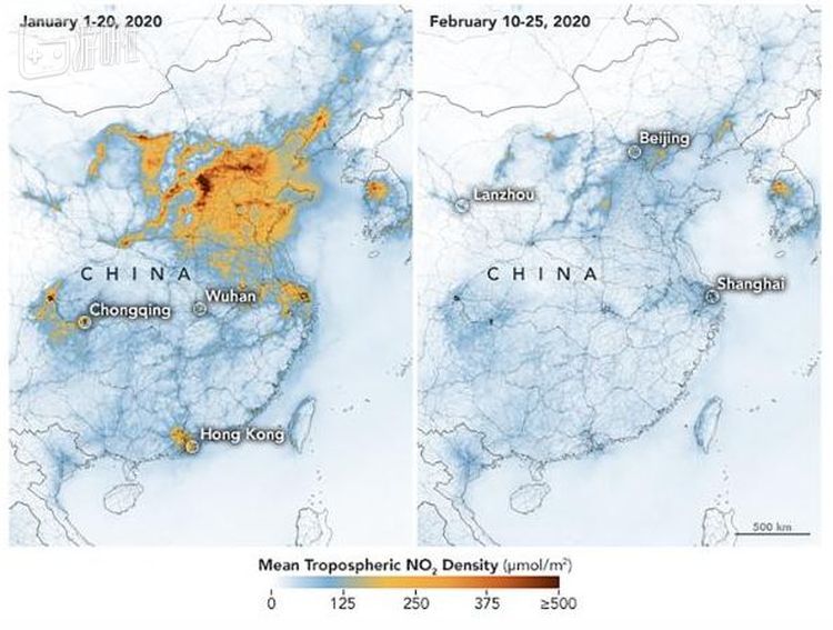 斯坦福大学的研究则表明,封锁期间导致的污染减量或许间接挽救了成千上万人类和动物的生命。而在稍早些的时候,有一张卫星图像也广为流传,那是中国2月10~25日的二氧化氮排量与前一个月的对比。