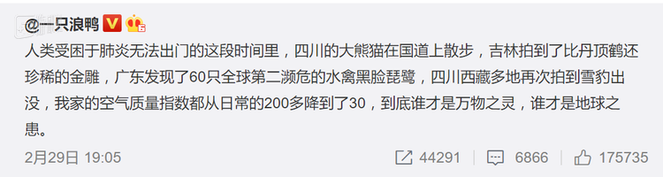 上个月底,大部分中国人已经在家宅了一个多月,现代的活动范围空前缩小,这时一个关于“自然恢复了生机,谁才是地球之患”的说法开始广为流传,它是这样的,你可能多半也看过类似的各种版本: