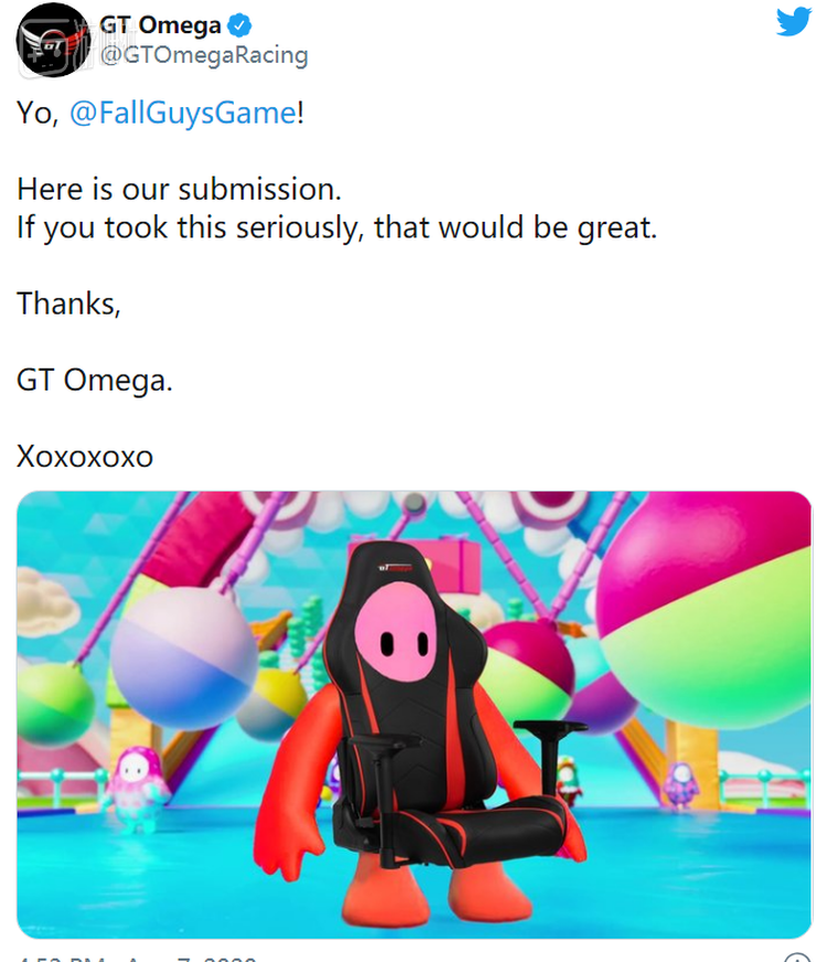 就这样,在Twitter上,《糖豆人》自创皮肤比赛愈发激烈起来。看到玩家们如此热心于给不同的品牌支招联动,一些厂商也忍不住了,干脆自己下场“参赛”。