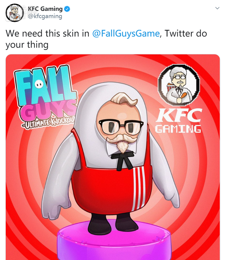 比如不久前还沉浸在《动物之森》中的KFC Gaming官方账号,把我们熟悉的桑德斯上校做成了糖豆人模样,并且非常直接地提醒《糖豆人》官方,声称“我们需要这样的皮肤”。