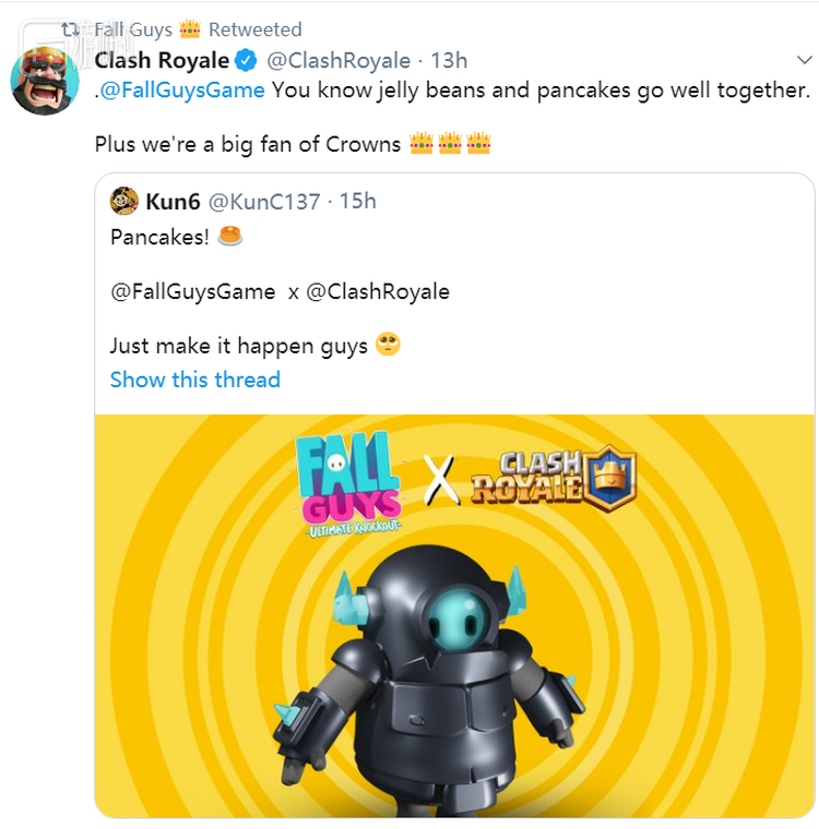 《皇室战争》的官方Twitter也特意跑来凑热闹,仔细想想两个游戏的画风似乎还挺对味。