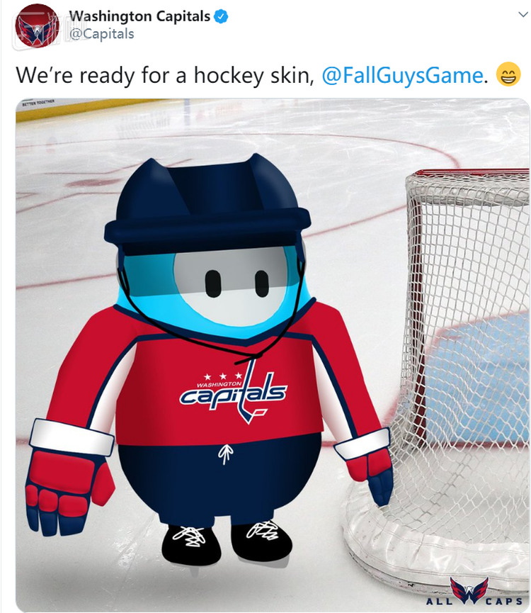 当然在游戏圈外,同样有人意图参与其中,例如Washington Capitals冰球队官方。他们也画出自己的糖豆人队服,并艾特官方希望能以这种方式“加入”游戏。