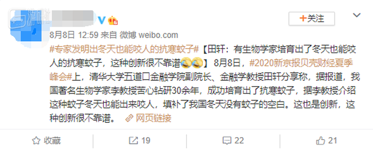 “我国某生物学家苦心钻研多年,终于成功培育出了冬天也能出来咬人的抗寒蚊子。这项创新将填补我国冬天没有蚊子的空白……”