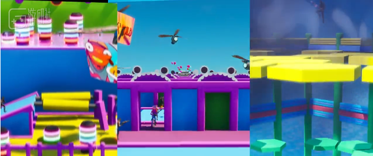其他作者也不乏制作精良的作品。Youtube主播Flysmooth这两天发布了他制作的“堡垒之夜版糖豆人”地图预告片,他的地图复刻了“蜂巢迷图”“闯门冲关”与“水涨爬高”三个关卡。