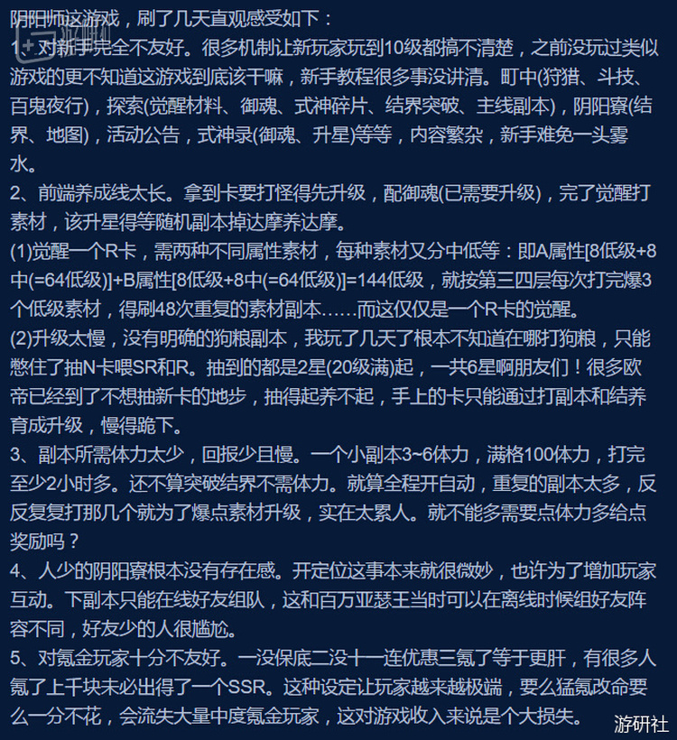 这位玩家的总结应该能反映很多人的心声,一部分是从魔灵带过来的“特色”,另一部分则是《阴阳师》在魔灵基础上做的劣化——大幅加长养成线,肝度翻倍